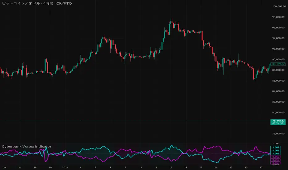 Cyberpunk Vortex Indicator は、トレンドの強さと方向性を直感的に把握するために設計された、視認性とデザイン性を重視したボルテックス系モメンタム指標です。