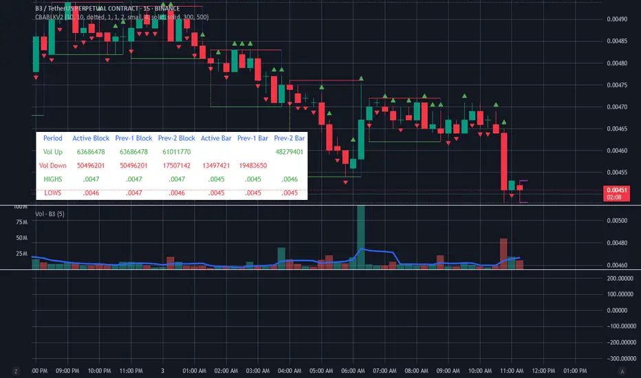 Purpose: The script—titled CBA BLOCK CHARTING VERSION 1—visually segments a price chart into “blocks” based on a fixed number of bars. Each block is analyzed to determine the maximum (high) and minimum (low) prices within that span, and these levels are marked with horizontal and vertical lines. Optionally, the script can also group multiple blocks into larger clusters to highlight broader market ranges.