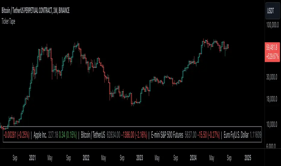 This indicator's tape display shows a list of security information that incrementally scrolls horizontally from right to left after new chart updates, providing a dynamic visual stream of current market data. The scrolling effect works by using a counter that increments across successive intervals after realtime ticks to control the offset of each listed security. Users can set the initial scroll offset with the "Offset" input in the "Settings/Inputs" tab.