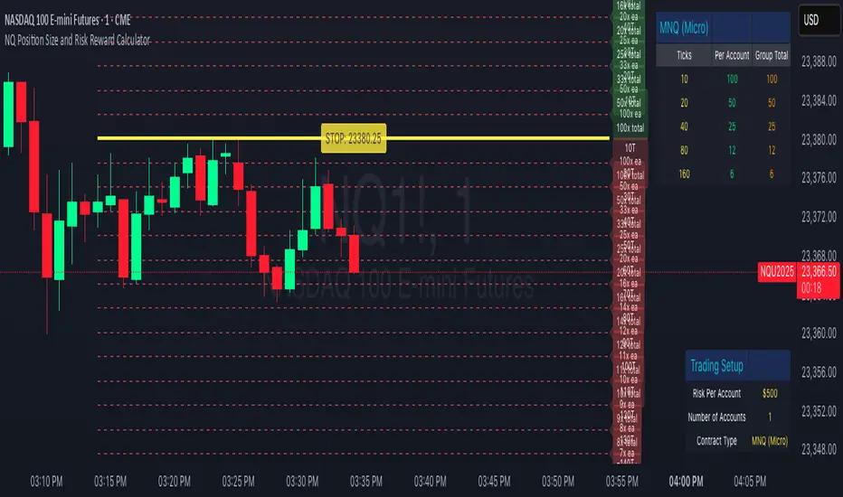 This TradingView indicator is a comprehensive position sizing and risk management tool specifically designed for NQ (E-mini Nasdaq-100) and MNQ (Micro E-mini Nasdaq-100) futures traders. It calculates optimal position sizes based on your risk tolerance, displays potential entry and exit levels, and provides visual guidance for multiple prop firm accounts.