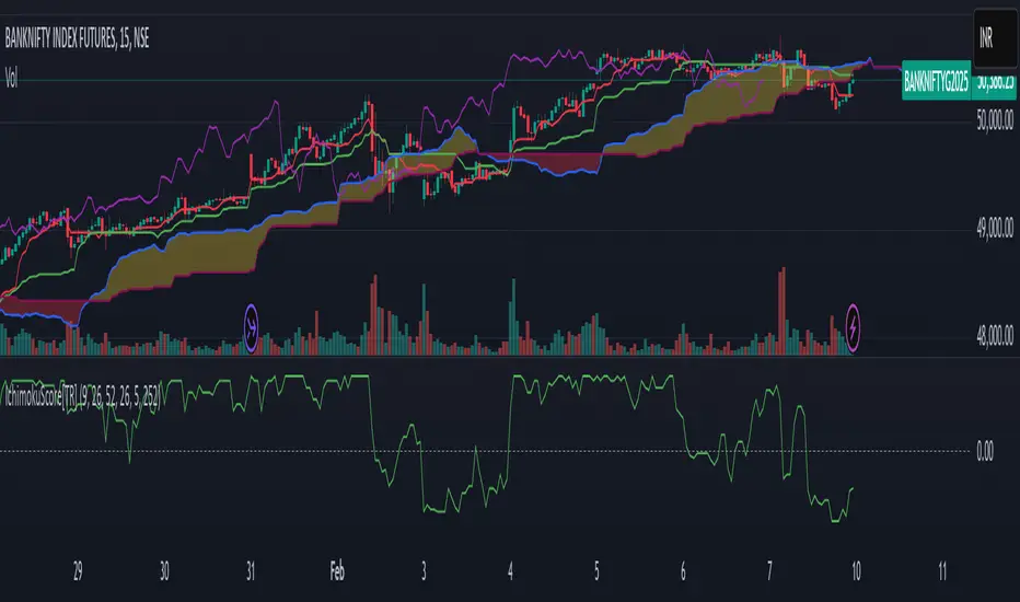 I have developed a scoring system that quantifies these interactions, offering an objective method to evaluate market conditions. The score is calculated based on the relative positioning of Ichimoku components, with adjustable weightings via user input.