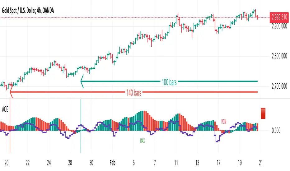Добавлено отображение максимального или минимального пика АО в интервале 140 баров от последнего бара. В настройках индикатора вы можете изменить интервал (в поле "Interval for MAX and MIN") и скрыть метки пиков АО.