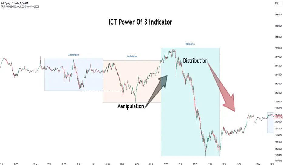 The ICT Power of 3 (PO3) indicator is designed to help traders analyze daily market movements by visually identifying the three key phases: Accumulation, Manipulation, and Distribution.