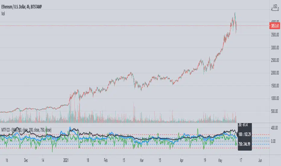 This is a CCI script adapted from 'CCI w EMA by Rick3712' which removes the EMA of the CCI and adds different sized CCI results to the same plot. An info box is also added for easy reference of current values.