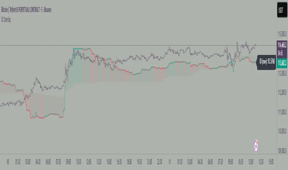 This indicator displays Open Interest (OI) data directly on your price chart as an overlay, eliminating the need for separate panes while preserving authentic OI movement patterns. Perfect for traders who want to analyze OI correlations without sacrificing chart real estate.