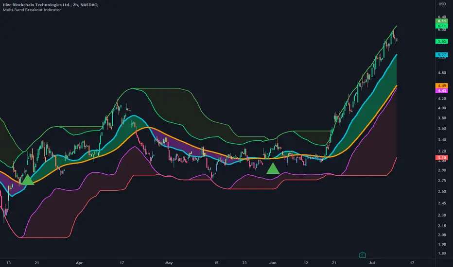 By incorporating coloration, the Multi-Band Breakout Indicator provides visual cues to traders, making it easier to interpret the relationships between various components and assisting in identifying potential trend changes and breakout opportunities. Traders can use these color cues to quickly assess the prevailing market conditions and make informed trading decisions.