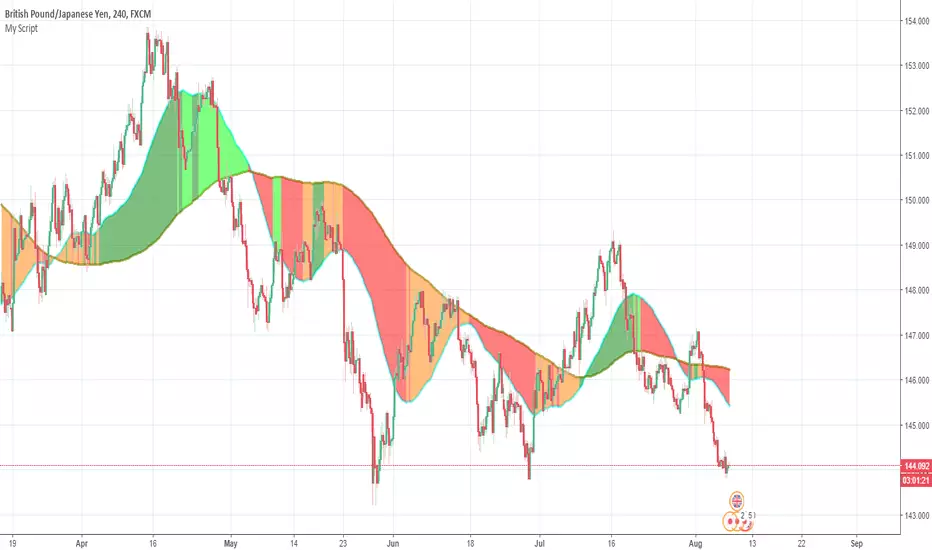 Here a script uses the moving average cloud. A sma (50, aqua) and a sma (200, olive) are plotted on the cart. When both sma go up the cloud is green. When both sma go down the cloud is red. When sma (200, olive) goes down and sma (50, aqua) goes up the cloud is orange. When sma (200, olive) goes up and sma (50, aqua) goes down the cloud is lime.