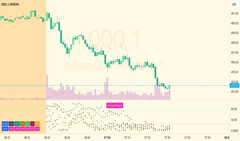 The indicator uses QQQ, SMH and NVDA to represent the technology side of the market, and XLF, XLV & IWM to represent everything else. It tracks where price is within the day's range for each of those symbols, and presents that data in a table and in also in a dot-based "map".