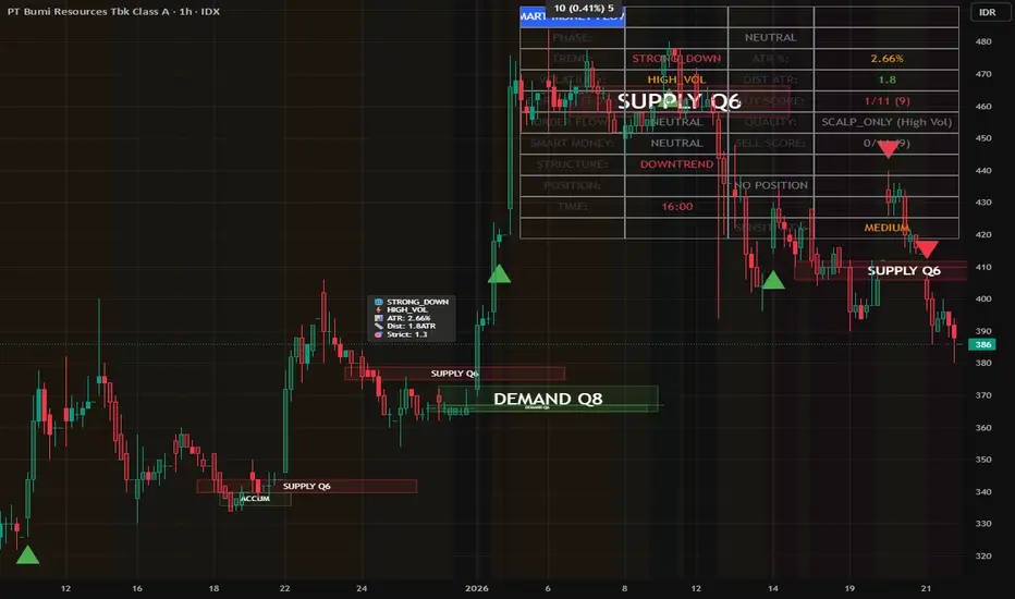 Smart Money Order Flow PRO is an advanced market analysis indicator designed to identify Smart Money activity, order flow imbalance, and institutional market phases such as Accumulation, Markup, Distribution, and Markdown.It combines market structure, liquidity grab detection, supply & demand zones, volume profile, and adaptive market regime filtering to deliver high-quality, non-repainting signals that adjust dynamically to volatility and trend conditions.