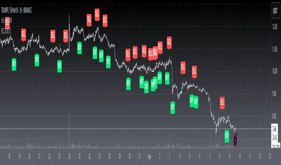 Buy/Sell Signals: Generates buy signals with green labels below the bar and sell signals with red labels above the bar.