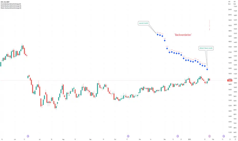 Carrying charge (contract prices increasing into the future) = normal, representing the costs of carrying/storage of a commodity. When this is flipped to Backwardation (contract prices decreasing into the future): its a bullish sign: Buyers want this commodity, and they want it NOW.