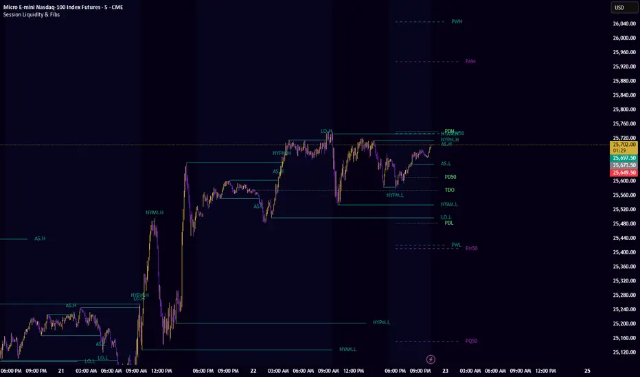 This is a comprehensive, all-in-one toolkit designed for traders utilizing ICT concepts and time-based liquidity runs. The Session Liquidity & Fibs indicator automates the tedious process of marking up charts, allowing you to focus on price action and execution.