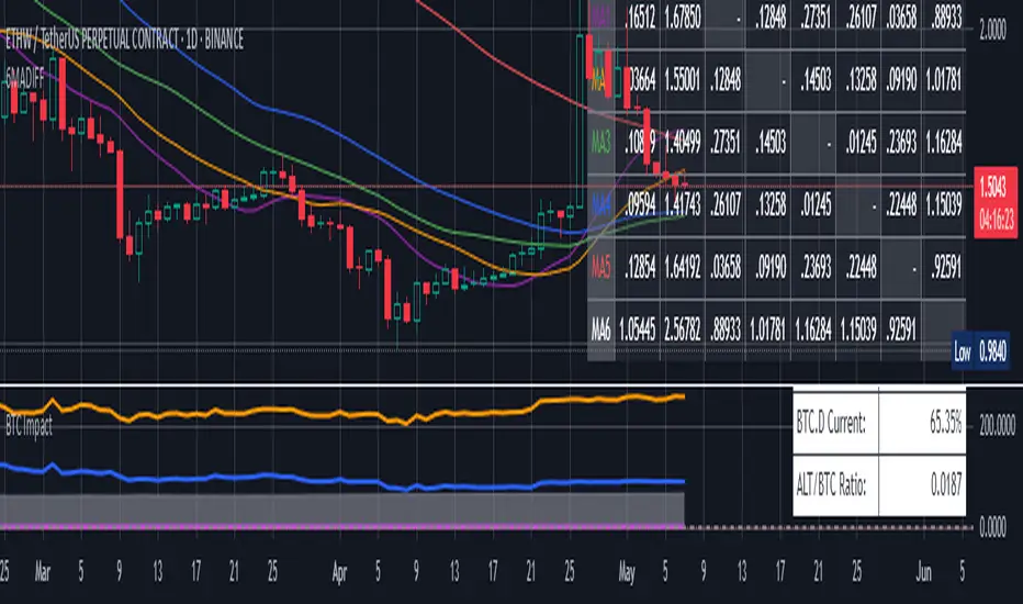 The "Bitcoin Impact Analyzer" script is designed to help traders and analysts understand the relationship between a chosen altcoin and Bitcoin (BTC). It does this by: