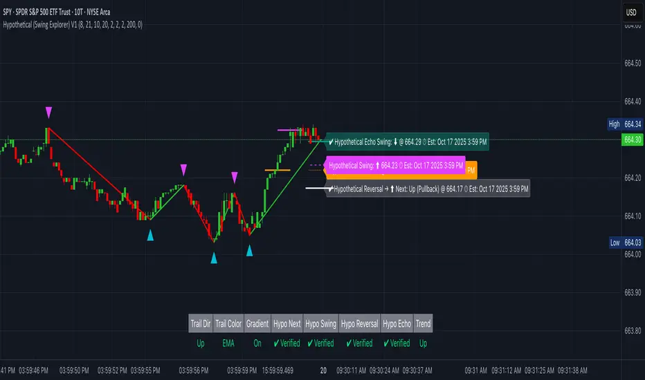 The Hypothetical (Swing Explorer) V1 is a Pine Script v6 indicator for TradingView, designed to analyze market structure and illustrate price movements. It combines a verified-pivot ZigZag (non-repainting), EMA-based trend context, pivot-anchored trail lines (with optional gradient fading and EMA/price color sync), an optional Zero-Lag guide from the last confirmed extreme, and illustrative “Hypothetical” marks (Next, Swing, Reversal, Forward Echo) with rough time estimates. A compact status table summarizes trend direction, trail state, and each hypothetical mark’s Pending/Verified status—useful when reviewing commonly watched swing scenarios.