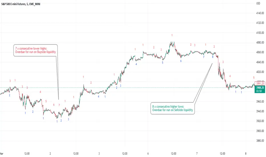 Counts consecutive Lower Highs and Higher Lows; number resets to zero when previous pivot high or low gets swept
