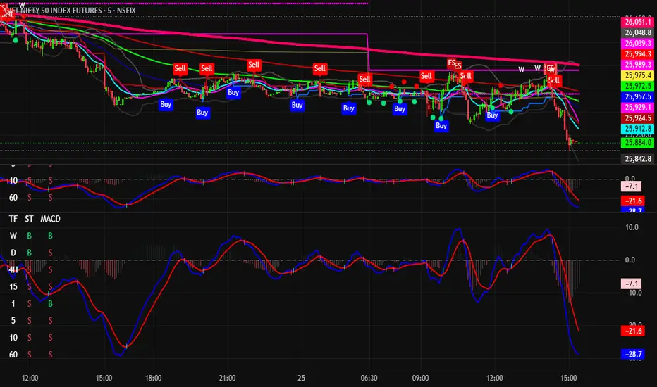 SELL (Red): The price is below the Supertrend line, indicating a downtrend for that timeframe.
