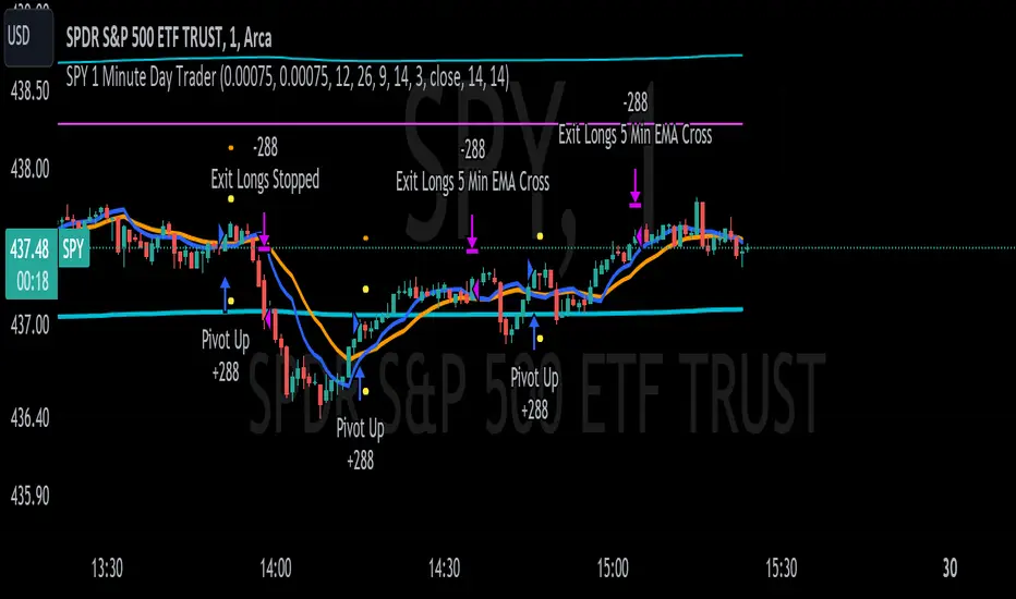 Will now only take partial profit for Pivot Up once above 2x when a candle closes below the 5 minute 13 EMA and for Pivot Down once below 2x when a candle closes above the 5 minute 13 EMAAdded 2x Take Profit Indicators as an orange tick mark