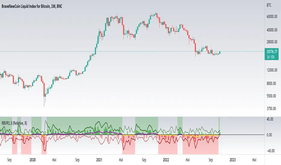 An advantage of using this kind of calculation is the possibility of separating the data into positive (buy pressure) and negative (sell pressure) components. The bi-directional character shows a slightly overhang in one of the directions, which can be used to detect a trend. A Moving Average of the users choice shell smoothen the overhang of the Relative Bi-Directional Volatility and show a trend direction. Similar to the math of the Relative Strength Index as standard a Relative Moving Average is preferred. If the Moving Average is in the positive range (0 to 100) it indicates a bullish trend, else if the Moving Average is in the negative range (0 to -100) it indicates a bearish trend. External Indicators can use a provided Trend Shift Signal which switches from 0 to 1, if the trend becomes bullish or from 0 to -1, if the trend becomes bearish.