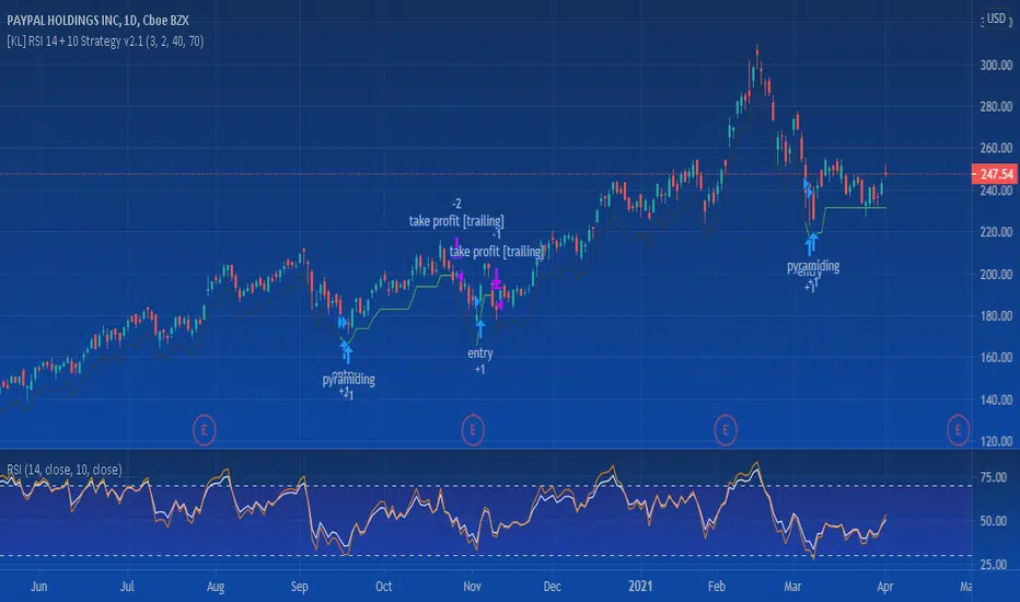 This strategy uses RSI14 for entry and exit signals; applies RSI10 for confirmation. The thresholds can adjusted in Settings.