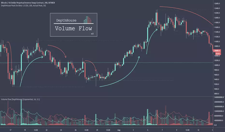 DepthHouse Volume Flow indicator is used to help determine trend direction strictly based on Negative and Positive volume data.