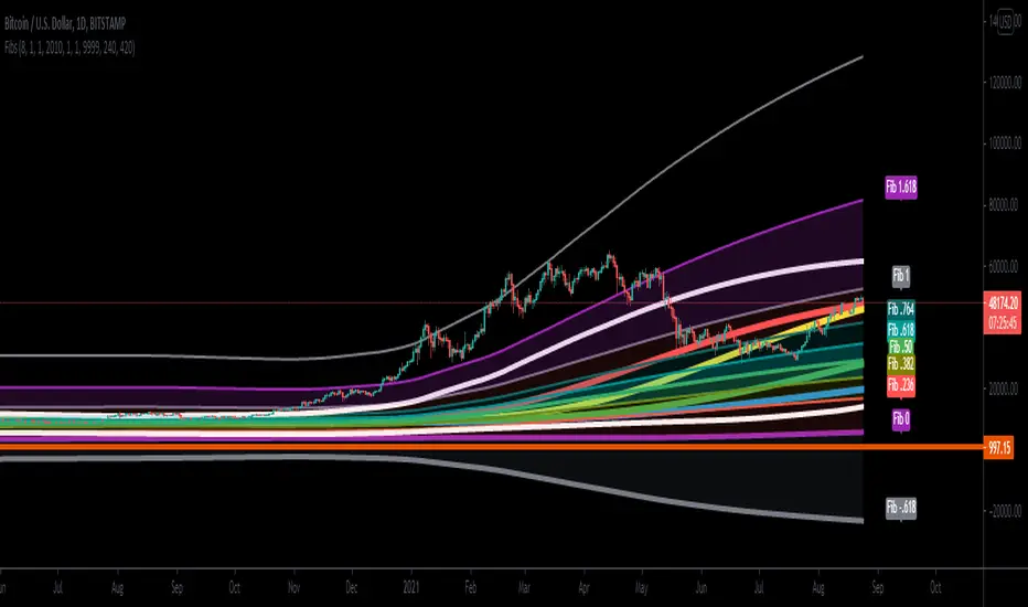 The 420 VWMA (Volume Weighted Moving Average) per period selected of the low price (Fib 0) and the high price (Fib 1). They are labeled in Color of the line they represent.