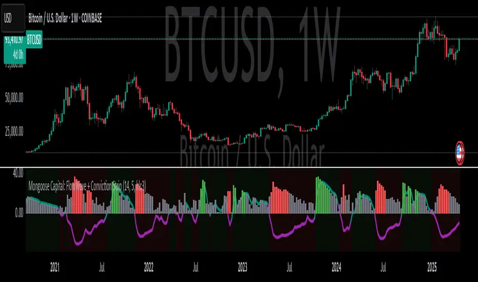 The Mongoose Capital: FlowWave + Conviction Strip is a refined visualization of money flow dynamics designed to identify shifts in volume pressure and trend strength.
