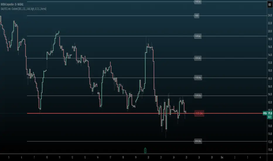 This indicator automatically plots horizontal lines at the Point of Control (POC) for each daily candle, intelligently clustering nearby levels to reduce visual noise and highlight the most significant price zones where volume concentration occurred.