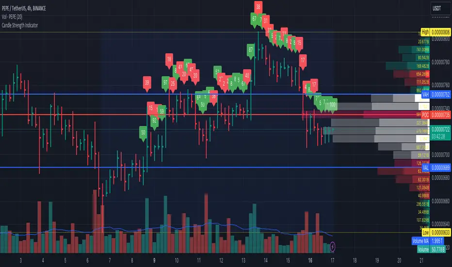 The strength is shown as a number on each candle, color-coded green for values 50 and above (bullish) and red for values below 50 (bearish). This visual representation helps traders quickly assess the strength and direction of price movements across different timeframes.