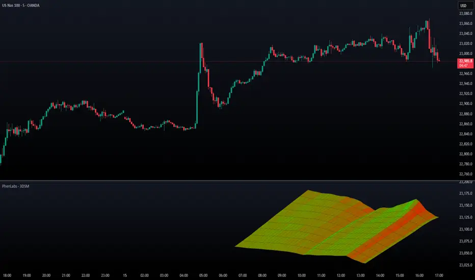 The 3D Surface Modeling indicator revolutionizes technical analysis by generating three-dimensional visualizations of multiple technical indicators across various timeframes. This advanced analytical tool processes and renders complex indicator data through a sophisticated matrix-based calculation system, creating an intuitive 3D surface representation of market dynamics.