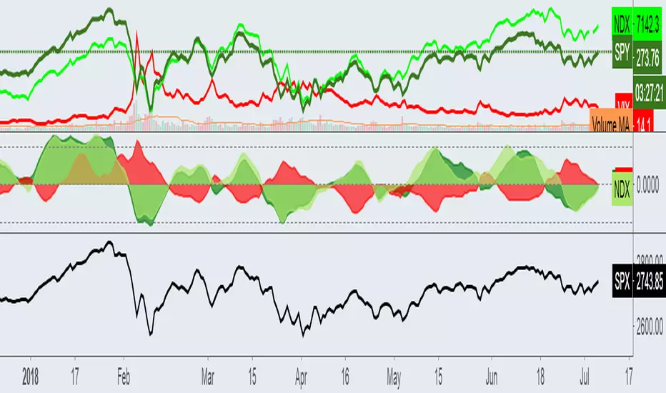 This script offers an SMI index of VIX, SPY, and NDX. Rather than overlaying VIX, NDX and SPY on the same chart.