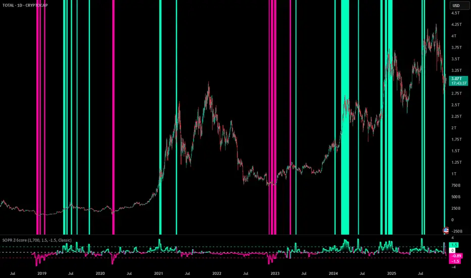 The Spent Output Profit Ratio (SOPR) is an advanced on-chain indicator that measures the ratio between the combined USD value of all Bitcoin outputs spent on a given day and their combined USD value at the time of creation. SOPR offers a window into aggregate seller behavior, effectively representing the USD amount received by sellers divided by the USD amount they originally paid. This indicator enhances this metric by normalizing it into a Z-score, and enabling customizable features for precision and visualization.