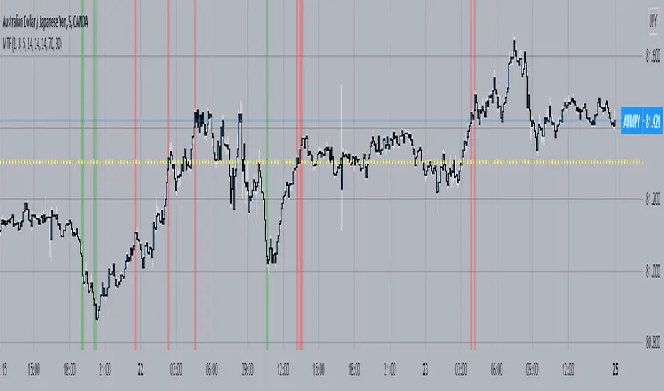 This indicator (on default settings) will let you know when the 1 minute, 3 minute, and 5 minute timeframes RSI & Stochastics are all in an overbought or oversold state. It shows this by changing the background color on your chart to red (overbought) or green (oversold).