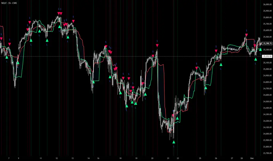 Trade Execution: Enter long on the green triangle below the bar following a close above the red top line; enter short on the red triangle above the bar after a close below the lime bottom line. The background glow provides immediate visual confirmation.
