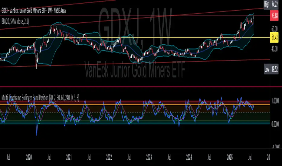 This indicator is an oscillator that measures the normalized position of the price relative to Bollinger Bands across multiple timeframes. It takes the price's position within the Bollinger Bands (calculated on different timeframes) and averages those positions to create a single value that oscillates between 0 and 1. This value is then plotted as the oscillator, with reference lines and colored regions to help interpret the price's relative strength or weakness.