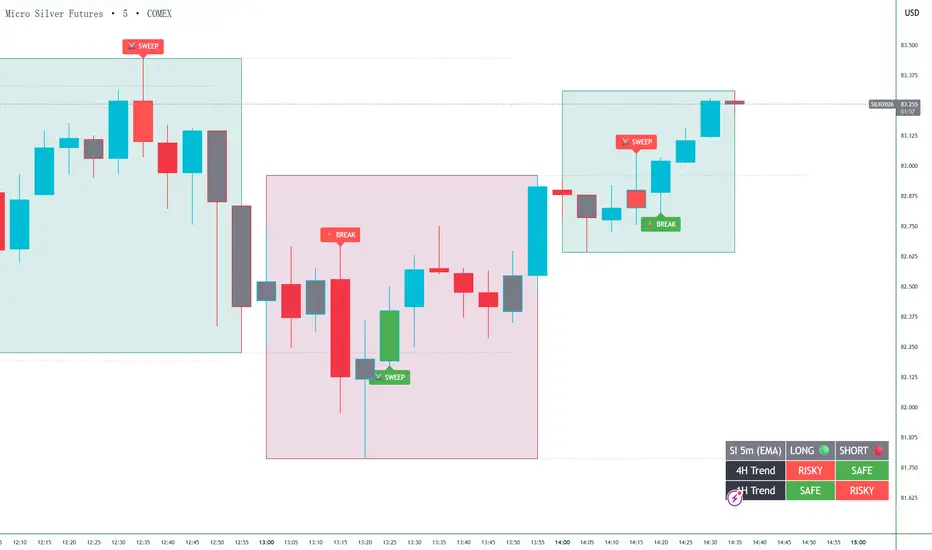 Dual-Layer Trend Guard: Includes a built-in HUD (Heads-Up Display) that tracks the 4H Macro Trend and 1H Session Trend using EMA filters. It instantly tells you if a Long or Short is "SAFE" or "RISKY" based on higher timeframe alignment.