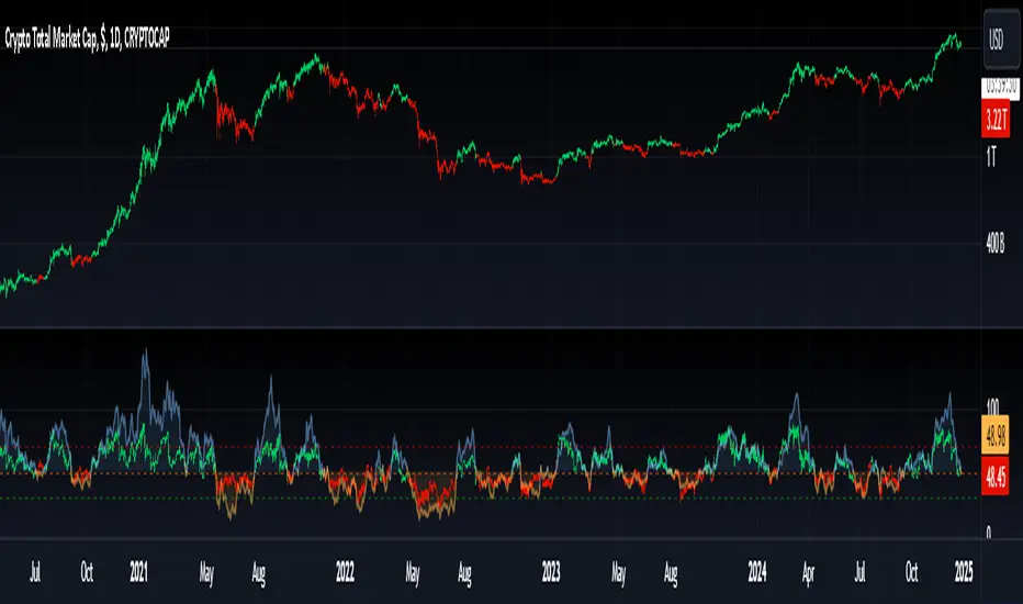 This indicator combines elements of the Relative Strength Index (RSI) and Rate of Change (RoC) to provide a smoother and potentially more insightful view of market momentum and price movement. The Smooth RSI [MarktQuant] calculates RSI values across four price points (high, open, low, close) to average them, offering a less volatile RSI signal. Additionally, it incorporates a Rate of Change for trend confirmation, enhancing the decision-making process for trade entries and exits.