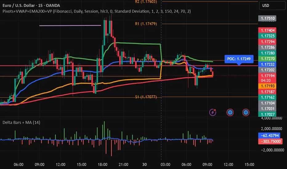 Pivot Points + VWAP + EMA200 + Fixed Range VP (POC) — a compact, all-in-one overlay that combines classic pivot levels, session-anchored VWAP with deviation bands, a 200-period EMA trend filter, and a fixed-range volume profile with Value Area and POC. Built for intraday and swing traders who want consolidated horizontal structure and volume context on one chart.