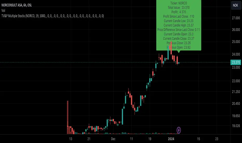 2. **Total Value and Profit:** For each of the entered stocks, the code calculates the total value of the holdings (number of shares multiplied by the current price) and displays it as a label on the chart. It also calculates the profit (or loss) by subtracting the purchase price from the current price per share and multiplying it by the number of shares. This provides traders with a quick overview of how much money they have invested and how much they have earned or lost.