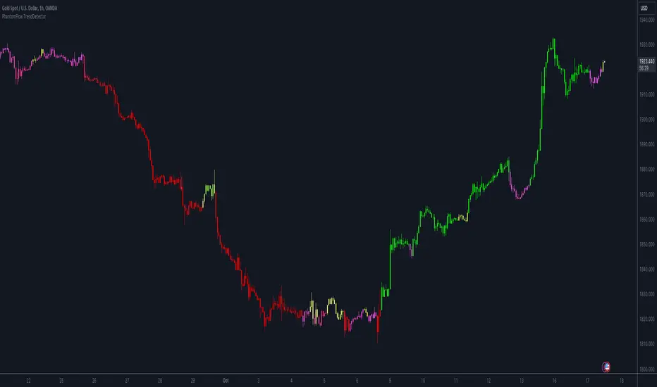The TrendDetector calculates waves on the chart using the built-in ZigZag indicator and detects a trend change after the last high/low update occurs in a minimum sequence of non-updated highs/lows. This assumes a continuation of the trend for the subsequent update of the remaining high/low.