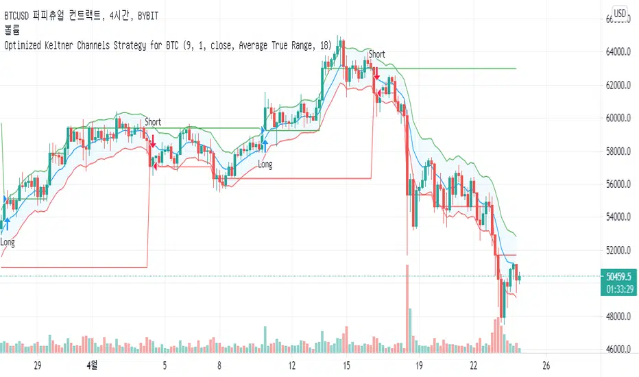 이 전략은 TradingView의 Built-in 전략인 Keltner Channel Strategy를 비트코인에 맞게 최적화되었습니다. 기존의 Keltner Channel Strategy는 Buy, Sell 신호가 캔들 중간에 실시간으로 떠서 진입 시점을 예측하기 어려운 불편함이 있었지만 이 전략은 비트코인 가격이 Keltner Channel 상단 혹은 하단을 찍고 종가를 마감하면 그 다음 캔들 시작가에서 Buy 혹은 Sell 진입이 가능하여 편리합니다. 또한, 이 전략은 Keltner Channel을 만나서 캔들을 마감한 가격 (bprice, sprice)을 시각적으로 plot을 제공하여 타점 및 차트를 보기에 편리합니다.
