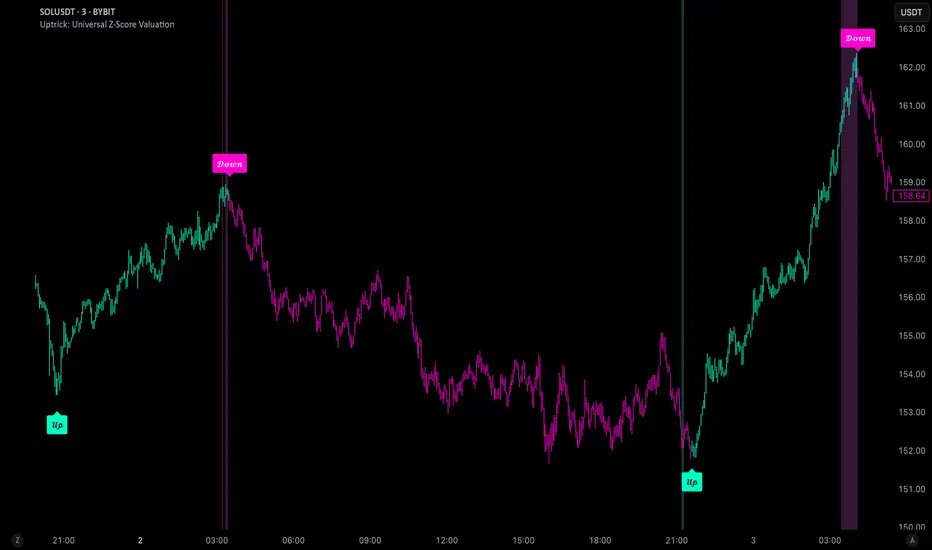 The Uptrick: Universal Z-Score Valuation is a tool designed to help traders spot when the market might be overreacting—whether that’s on the upside or the downside. It does this by combining the Z-scores of multiple key indicators into a single average, letting you see how far the current market conditions have stretched away from “normal.” This average is shown as a smooth line, supported by color-coded visuals, signal markers, optional background highlights, and a live breakdown table that shows the contribution of each indicator in real time. The focus here is on spotting potential reversals, not following trends. The indicator works well across all timeframes and asset classes, from fast intraday charts like the 1-minute and 5-minute, to higher timeframes such as the 4-hour, daily, or even weekly. Its universal design makes it suitable for any market — whether you're trading crypto, stocks, forex, or commodities.