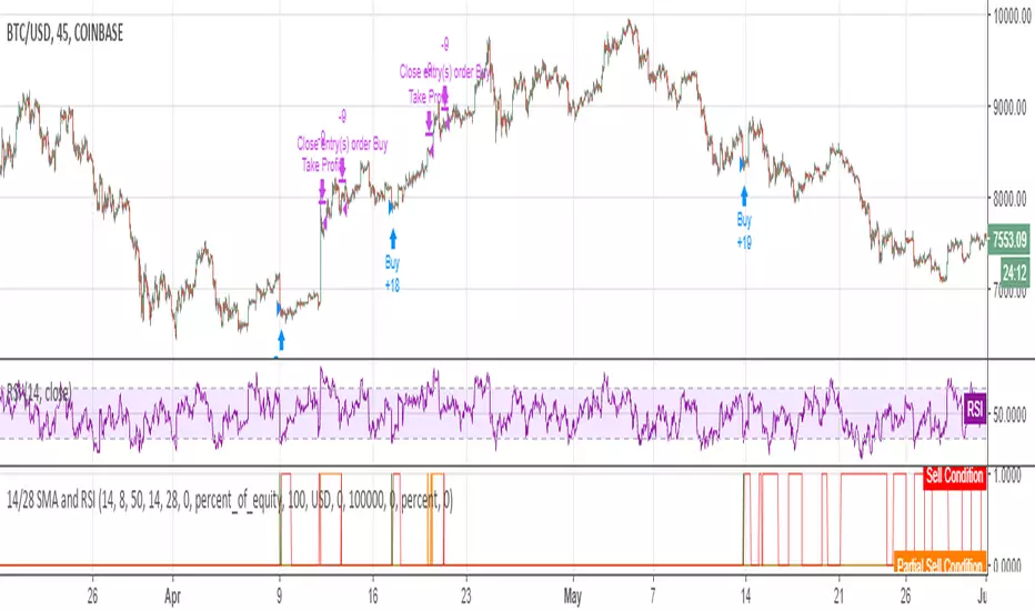 This strategy script uses a 14-day SMA signal line, a 28-day SMA and RSI. The strategy works by determining whether the (14-day SMA is above the 28-day SMA and the RSI levels are overbought(below 30)) or RSI is very overbought(below 13 or so). Once either of these conditions have been met, a long position is opened.