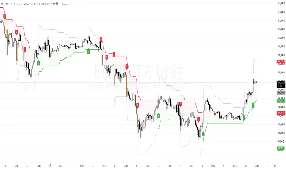 • 反向轨道线:显示对立方向的 Supertrend 带(淡绿/淡红虚线),清晰标记潜在反转区域