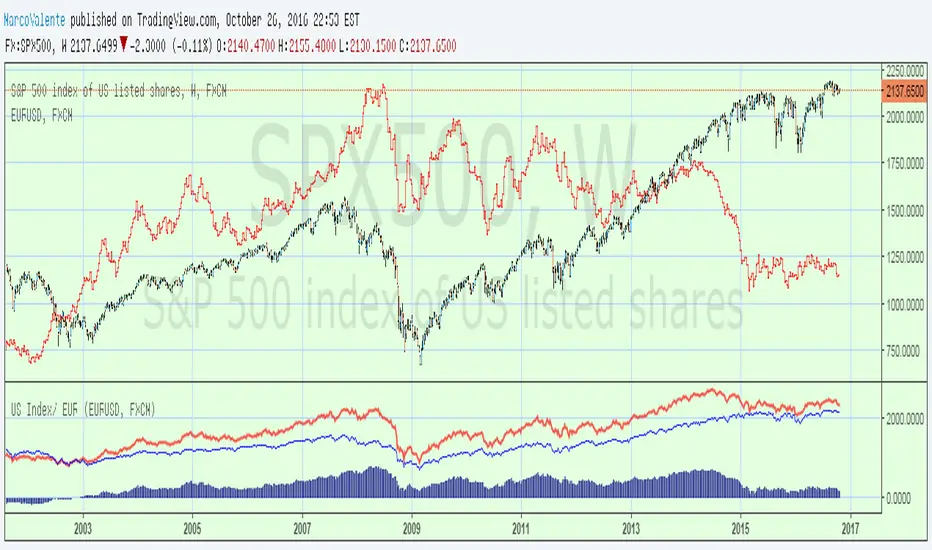 This is a EURUSD converted index. It show the value of the index at the EURUSD current ratio. The Histogram is the spread between the index and the index in Euro. So if you use Euro to buy US stock, you can check at the spread and try to enter with high level spread (this is when Euro is strong) and exit when is low (like now). This can add a bit of profit to our trade. The opposite can be used by US investitor that want to buy stocks in EURO.