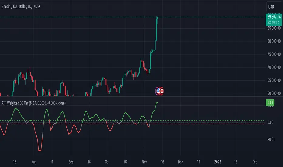 The ATR-Weighted CG Oscillator is an enhanced version of the Center of Gravity (CG) Oscillator, originally developed by John Ehlers. By adding the Average True Range (ATR) to dynamically adjust the oscillator’s values based on market volatility, this indicator aims to make trend signals more responsive to price changes, offering an adaptive tool for trend analysis.