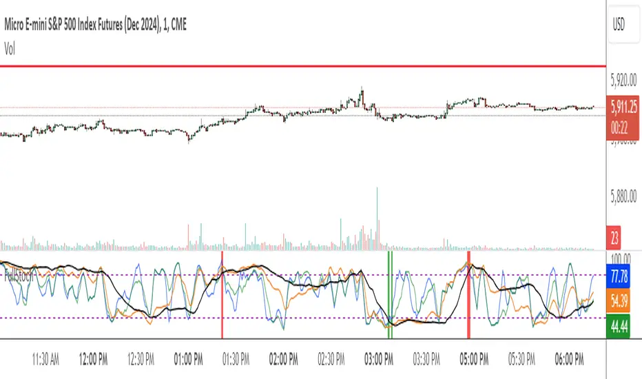 This Pine Script is a versatile Full Stochastic indicator designed to help traders identify potential entry and exit points in the market. It calculates four Stochastic oscillators based on various lookback periods (9, 14, 40, and 60) and applies Simple Moving Averages (SMA) to smooth the outputs. The script provides visual alerts through background color changes, offering traders an intuitive way to interpret market conditions.Key Features: