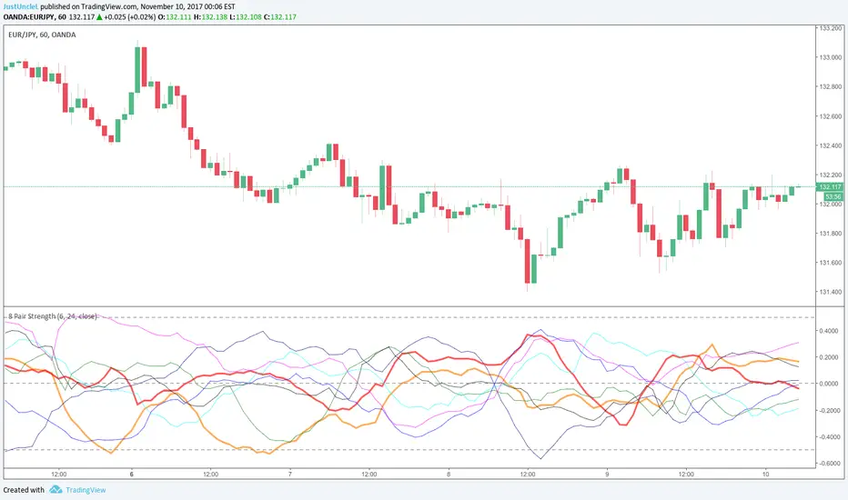 This study is a version of Currency Strength Meter, that utilises TradingView's built-in "True Strength Index" (TSI) function. The TSI uses moving averages of the underlying momentum of a financial instrument.