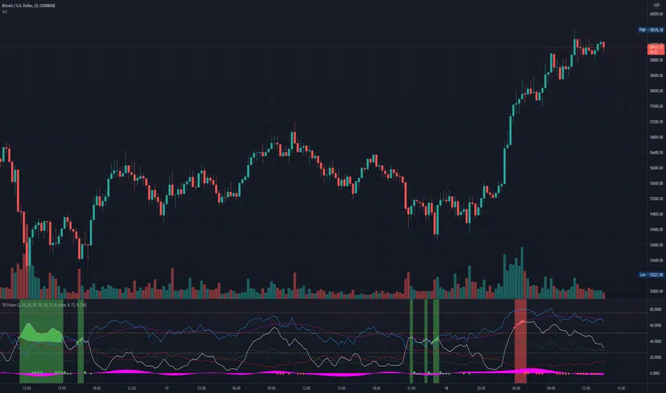 This script works very well on the 15 minute timeframe with the default settings on most symbols, especially cryptocurrency. Usually, the larger the timeframe, the bigger the move.