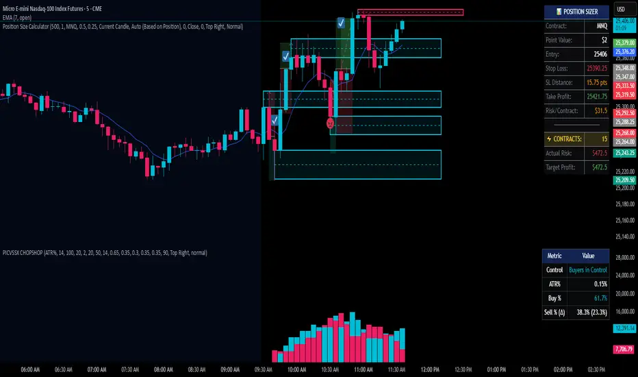 Enter your dollar risk amount and the indicator automatically calculates the number of contracts you can trade with your stop loss placed at the candle's high or low. No more manual math — just glance at the table and execute.