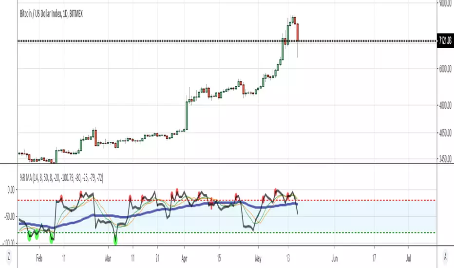 This indicator comes with adjustable (ma-ema and wma) moving averages, applied on Williams %R signal. So whenever Williams %R crossover SMA or EMA it's an indication of stock/coin price is moving upwards while it crossunder SMA or EMA values, it's an indication of price will go downwards. Convincigly though each crosspoints have their own custom colors, so you can identify if it's going up or down.
